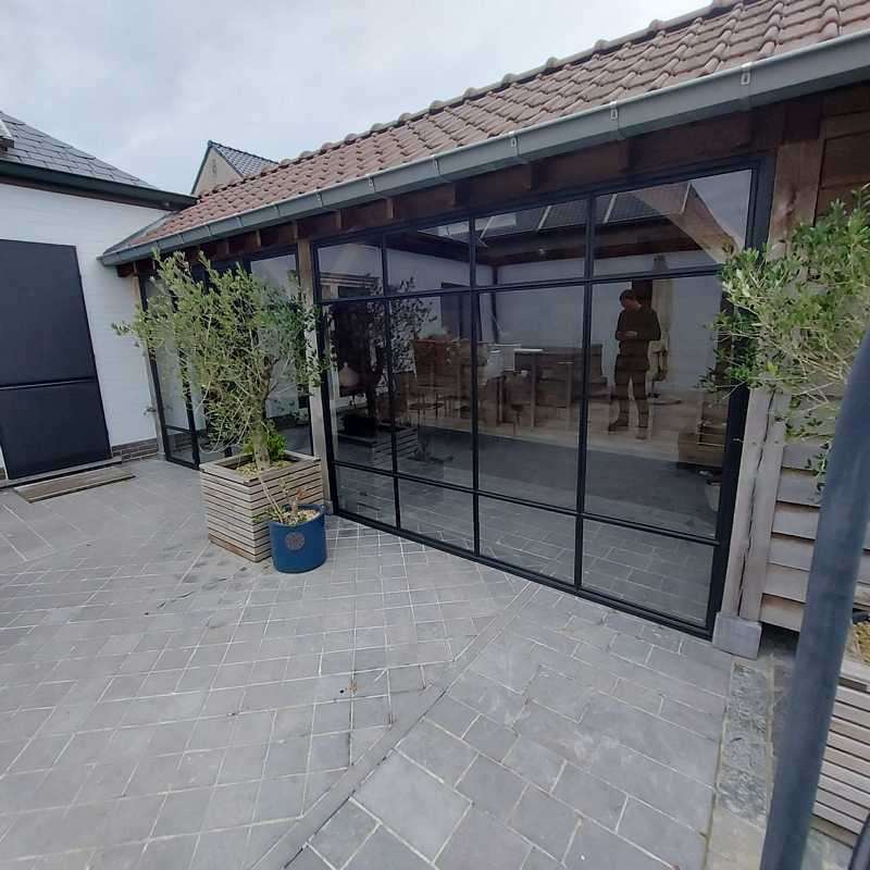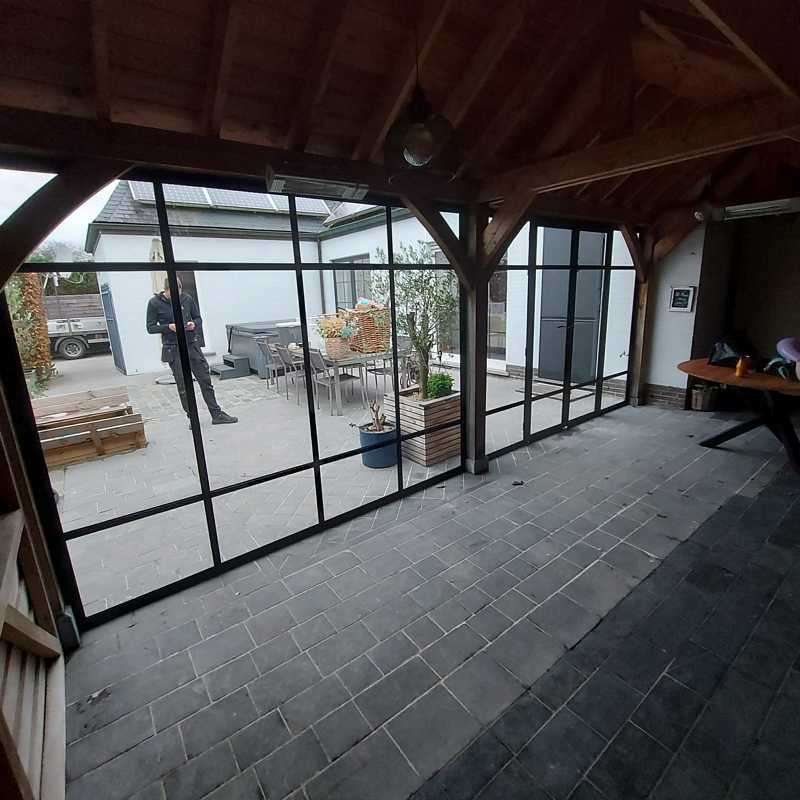 “Voor stalen binnendeuren of wanden kunt u kiezen voor helder gelaagd glas. Het stalen frame zorgt voor een slanke uitstraling. De verdeling van het glas kan naar wens worden aangebracht en is gemaakt van glaslatten.”